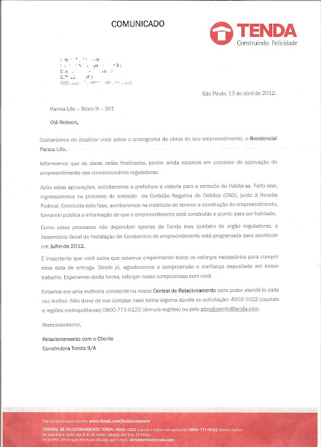 Relatarei neste blog a minha infeliz experiência de comprar um imóvel da construtora Tenda/Gafisa. Criei este blog para trocar idéias, repassar dicas, enfim , divulgar e dividir os conhecimentos e conhecer ainda mais os futuros moradores do Residencial Parma Life. Desejo que minha história faça eco e seja um alerta para aqueles que estejam interessados em negociar com esta empresa.