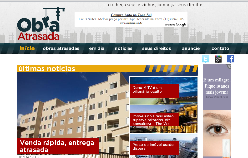 Estamos lançando o site www.obraatrasada.com.br para registrar todas as obras em atraso, problema que afeta milhões de brasileiros.